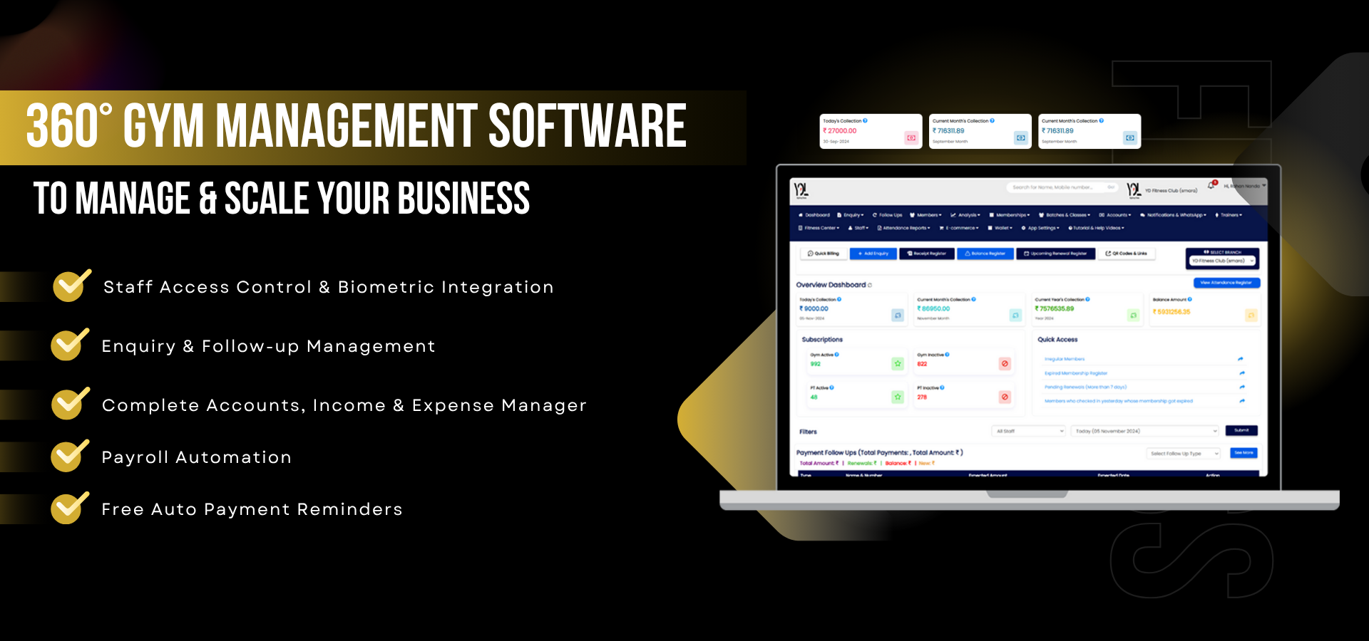 activities like enquiry, attendance, follow-ups, expenses, reports etc. at one place. YDL gym management